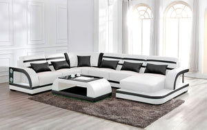 The spacious Grando Modern Sectional with Speaker and LED Lights has contrasting colors that are available in 10 different colors of genuine Italian or bonded leather. It features two storage spaces perfect for books or magazines. The sides of this leather couch are illuminated by a LED light. It can be optionally upgraded to multi-color lights that can be controlled by a wireless remote. This lively, modern sectional is a must have for every contemporary home. Bluetooth speakers are featured on one end of this sectional so you can enjoy your music in comfort from the help of your phone. The unique geometric design on the sides of this couch quickly catches the eye of visitors. To complete the look of your living space we recommend adding the ottoman and coffee table. Cup holders and USB ports are recommended for larger families to optimize maximum enjoyment. An additional bed function makes a great movie night with the family or space for unexpected guests. With the generous size of this sectional, family and friends will gladly socialize in comfort.