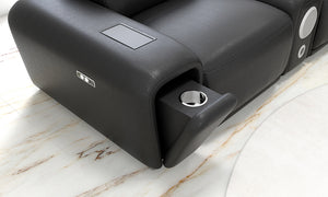 Two power recliners are positioned at each end for ultimate relaxation, allowing you to stretch out at the push of a button. A built-in Bluetooth speaker system delivers immersive sound—perfect for movie nights or casual gatherings—while the smooth contours and adjustable headrests bring a refined yet cozy aesthetic.