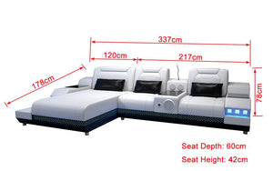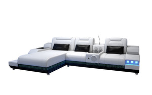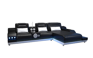 Its layout includes a versatile chaise, LAF or RAF Chair, Console, and armless chair giving it both style and flexibility to fit your living space needs. The LED-lit side platform adds ambient glow while the rounded edges keep the look soft and inviting.