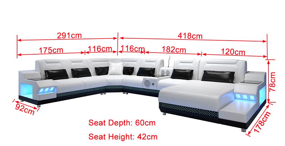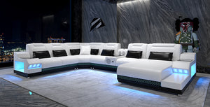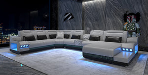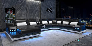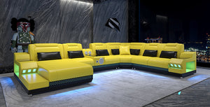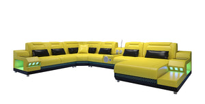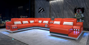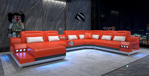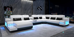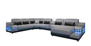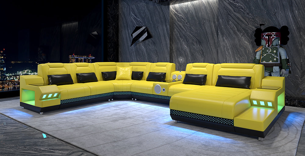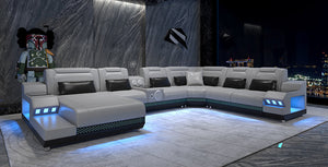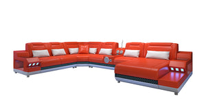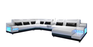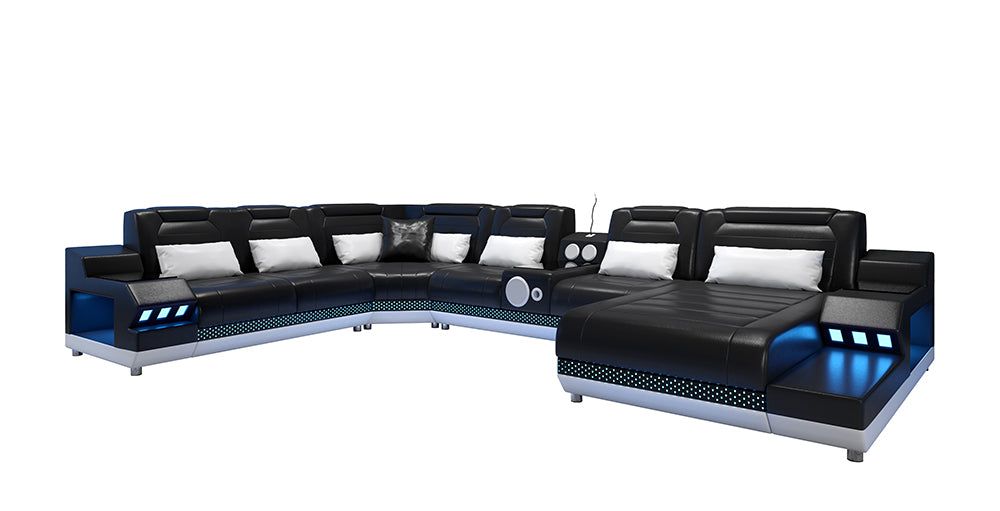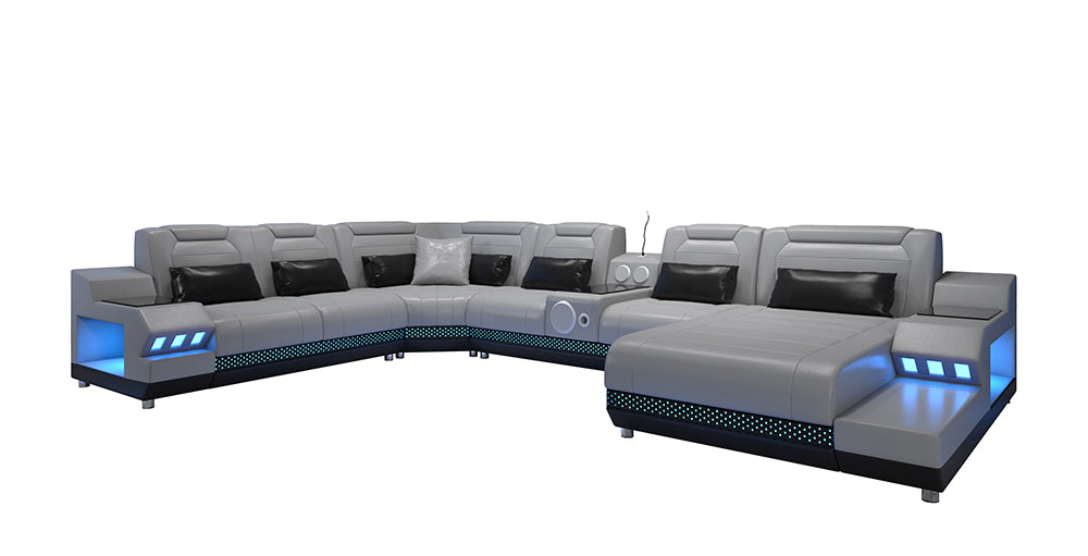 Its layout includes a versatile chaise lounge, a console with built-in Bluetooth speakers, armless chairs a corner unit, and a left- or right-facing loveseat, giving it both style and flexibility to fit your living space needs. The LED-lit side platform adds ambient glow while the rounded edges keep the look soft and inviting.