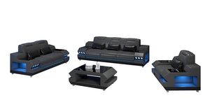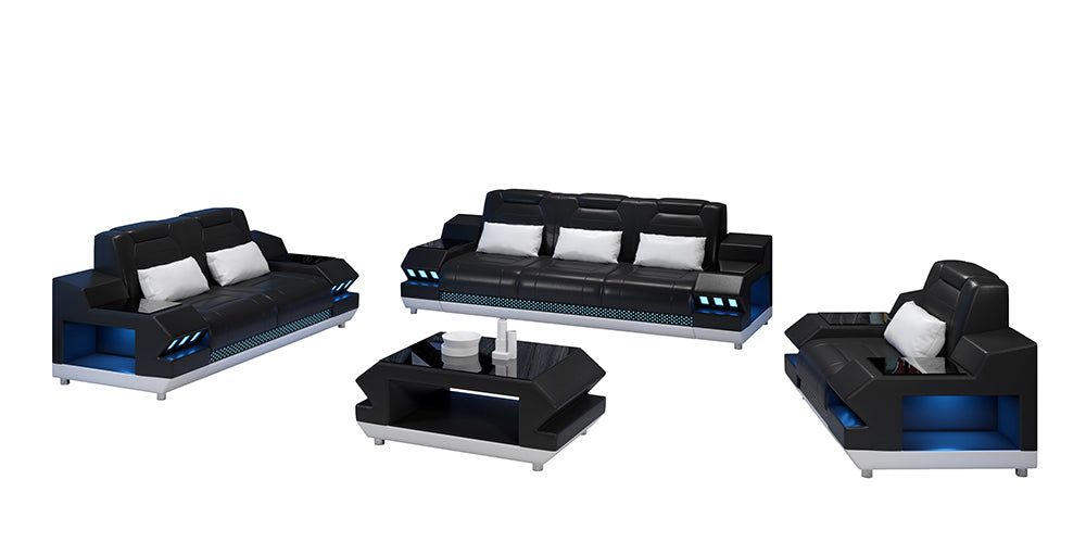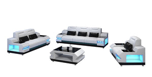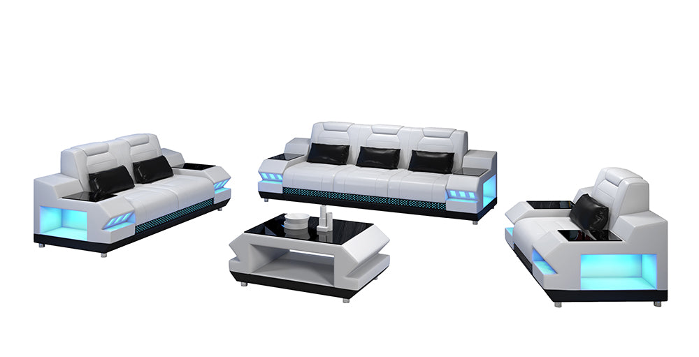 Its layout includes a versatile sofa, loveseat, and chair giving it both style and flexibility to fit your living space needs. The LED-lit side platform adds ambient glow while the rounded edges keep the look soft and inviting.