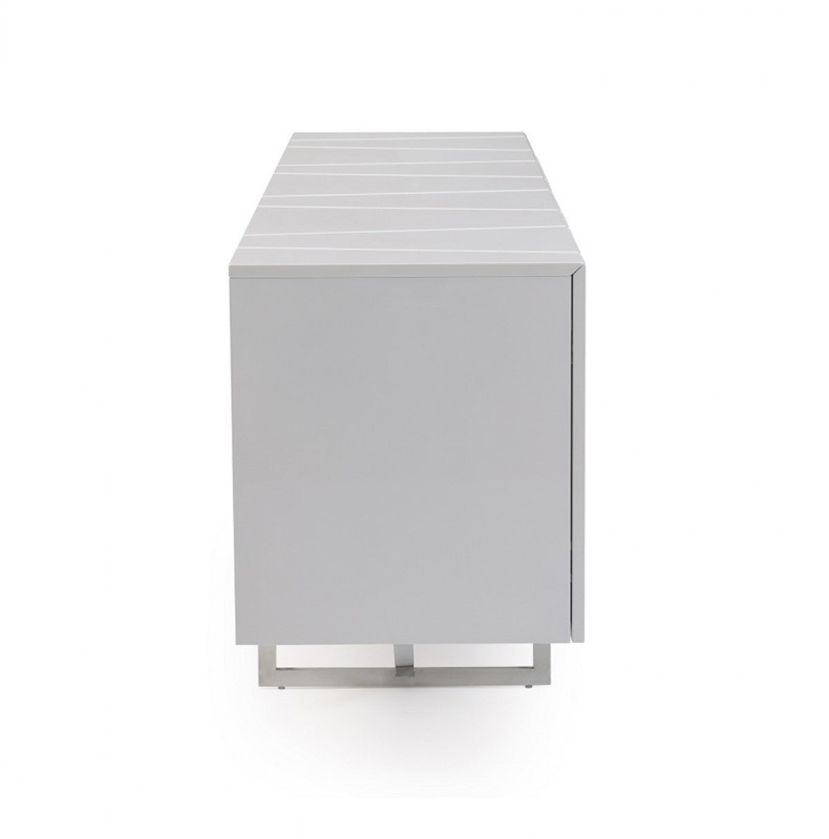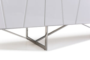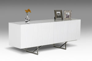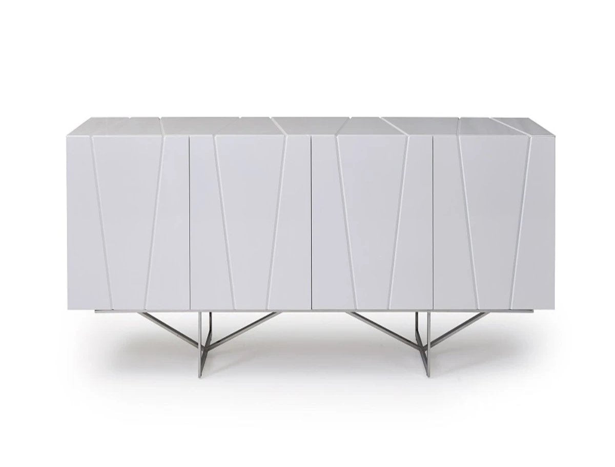 This modern buffet table is a unique and interesting addition to your dining space. The neutral colors allow for this piece to easily blend in with your dining area. Spacious doors allow for maximum storage for dishes, silverware, or decor items. With the white finish, this buffet can easily be dressed up or down. We recommend a minimalist or modern aesthetic for this buffet.