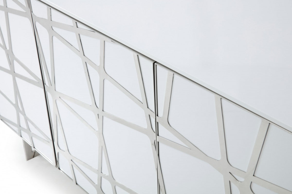 This modern buffet table is a unique and interesting addition to your dining space. The neutral colors allow for this piece to easily blend in with your dining area. Four spacious doors allow for maximum storage for dishes, silverware, or decor items. With the white finish, this buffet can easily be dressed up or down. We recommend a contemporary or eclectic aesthetic for this buffet.