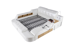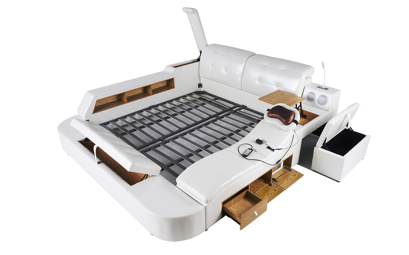 This futuristic bed is the ultimate enclosure system that comes with everything you need in a room, ALL IN ONE. It features a massage chair with a remote, a built-in Bluetooth speaker, a bookshelf, a reading lamp, and a desk for those who need a laptop in their bed. Never leave the bed with a low battery, this has a built-in charging station perfect for night owls. Adjust the top headrests to get maximum comfort in your bed. Access an ottoman for guests that are stored under the conditioning unit. If you would rather lay down on the side of the bed and watch TV, do not fret. There is a massage chaise attached just for you. This adult playground is revolutionary for many reasons. The frame is made of pine wood for long-lasting quality. Available in multiple colored leather options. Only make one purchase, and everything you need is at your disposal.