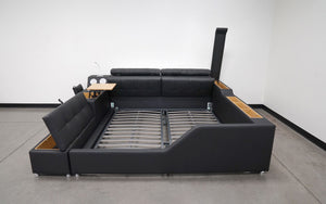 This innovative bed is designed to provide ample storage space without compromising on comfort or style. With storage options built into the headboard, ottoman, side shelf, and drawers, you can say goodbye to clutter and hello to a clean and organized sleeping space. The Smart Bed storage system is the perfect choice for anyone looking to maximize their bedroom's storage potential while maintaining a sleek and sophisticated look. Say goodbye to clutter and hello to a better night's sleep with the Smart Bed storage system.