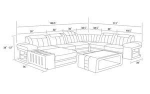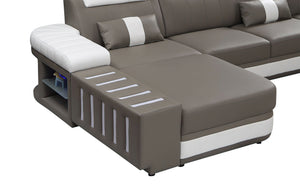 The Angelas Leather Sectional with LED Light is available in two-toned or contrasting colors in Italian leather and bonded leather. Choose your preferred color leather from a selection of 10 distinct colors. The sleek, inviting design of this couch quickly catches the eye of visitors. Crafted custom to fulfill your desired aesthetic. Choose your configuration left hand facing or right-hand facing chaise to customize to your desired design. It features two storage spaces perfect for books or decorative items. The side of this leather couch are illuminated by a LED light. It can be optionally upgraded to multi-color lights that can be controlled by a wireless remote. Each top headrest is adjustable. This sleek, modern sectional is a must have for every contemporary home. To complete the look of your living space we recommend adding the armless chair and coffee table. Cup holders and USB ports are recommended for larger families to optimize maximum enjoyment. An additional bed function makes a great movie night with the family or space for unexpected guests. With the generous size of this sectional, family and friends will gladly socialize in comfort.