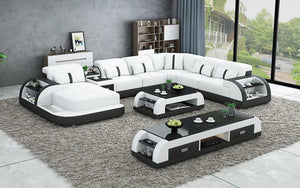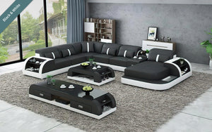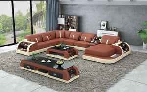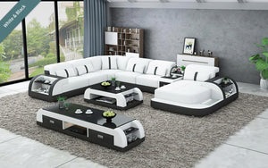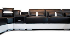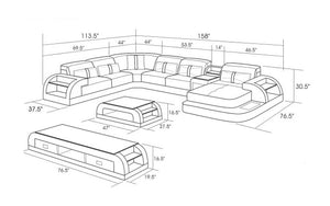 Experience ultimate style and comfort with the Blaylock Modern Sectional Sofa with LED light. The U-shaped leather sectional offers a range of features, including a console table with a drawer and removable glass top for drinks and snacks. Adjustable headrests allow for customizable comfort, while storage solutions at the end of the armrests provide ample space to keep your living room organized. The built-in LED panel adds a touch of luxury and futuristic flair, and the customizable layout allows you to personalize the sectional to match your existing decor. Choose from top grain Italian leather or bonded leather, both with the built-in LED panel.