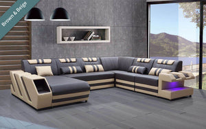 The Neptune Modern Leather Sectional with LED lighting is available in two-toned or contrasting colors in Italian leather and bonded leather. It features two storage spaces perfect for books or magazines.  The side of this leather couch are illuminated by a LED light. It can be optionally upgraded to multi-color lights that can be controlled by a wireless remote. Each top headrest is adjustable. Choose your configuration left hand facing or right-hand facing chaise to customize to your desired design. This modern couch is a stylish and lively addition to your living space. The unique angular design on the sides of this sectional quickly catch the eye of visitors. To complete the look of your living space we recommend adding the ottoman and coffee table. Cup holders and USB ports are recommended for larger families to optimize maximum enjoyment. An additional bed function makes a great movie night with the family or space for unexpected guests. With the generous size of this sectional, family and friends will gladly socialize in comfort.