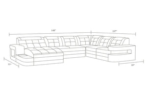 The Uranus Leather Sectional with LED Light is available in two-toned or contrasting colors in Italian leather and bonded leather. Choose your preferred color leather from a selection of 10 distinct colors. The sleek, inviting design of this sectional quickly catches the eye of visitors. Crafted custom to fulfill your desired aesthetic. The spacious arched chaise is perfect to lay down and rest after a busy day. Choose your configuration left hand facing or right-hand facing chaise to customize to your desired design. It features two storage spaces perfect for books or magazines. The side of this leather sectional are illuminated by a LED light. It can be optionally upgraded to multi-color lights that can be controlled by a wireless remote. This sleek, modern sectional is a must have for every contemporary home. To complete the look of your living space we recommend adding the armless chair and coffee table. Cup holders and USB ports are recommended for larger families to optimize maximum enjoyment. An additional bed function makes a great movie night with the family or space for unexpected guests. With the generous size of this sectional, family and friends will gladly socialize in comfort.