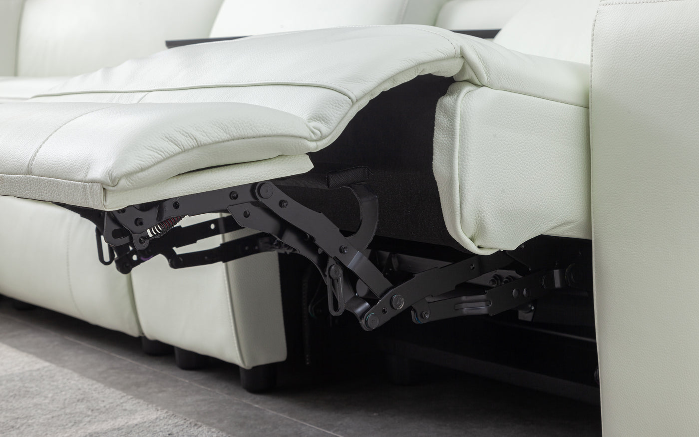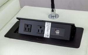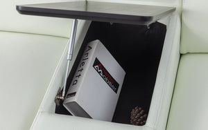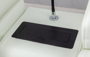 Smart and cozy choice for your living room. This spacious sectional features two recliners, a console table with storage space, two outlets, and four USB ports. This sectional has two recliners that let you adjust your position with a touch of a button. The armrests also have USB ports and side storage compartments for your convenience. You can choose from fabric or top-grain Italian leather upholstery in various colors to suit your taste. The sectional is filled with high-density foam for comfort and durability, and has side tufting and brushed stainless steel legs for a sleek look.