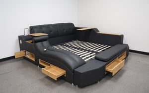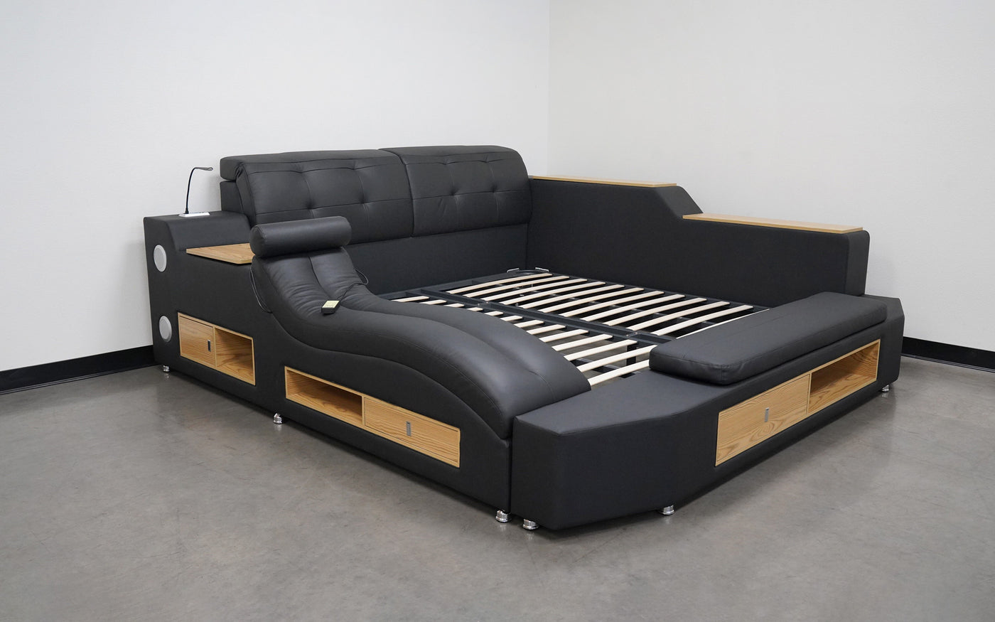 This unique design is both comfortable and looking cool! This ultra-modern bed features a massage chaise that can be controlled by a remote, a built-in charging station that has USB hookups, built-in Bluetooth speakers, and desks for people who want to use a laptop or read in the bed. The matching side storage includes storage cabinets with subtle openings at the base that are convenient for you to store books and magazines. Also, there is more storage space that can be found along the bed. This deluxe design is a perfect choice for you to enjoy an ultra-modern life. Now, this product is available in multiple colors, sizes, layouts, and materials. You can also customize it if you like!