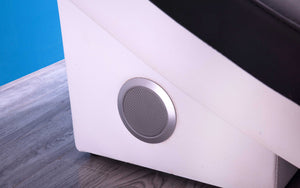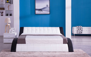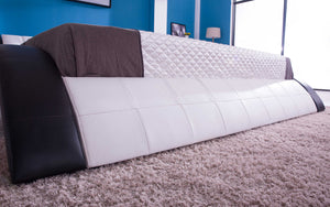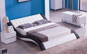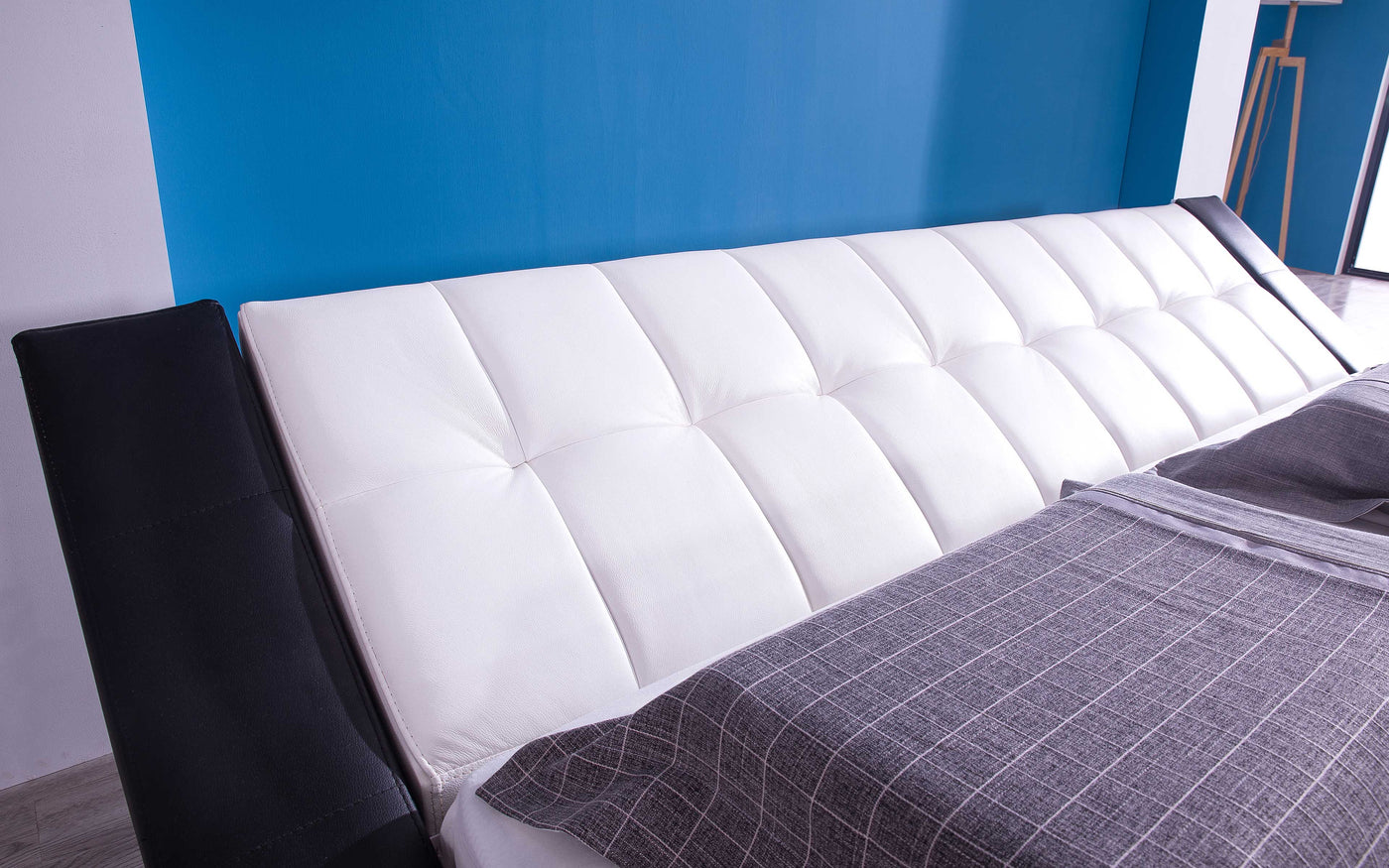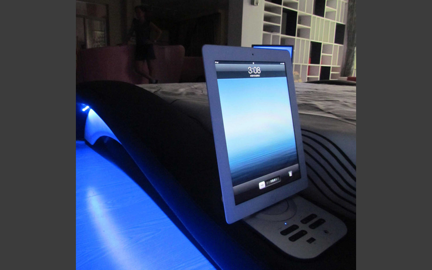 The hand-made leather smart bed is the coolest design that contains both discreet elegance and high-tech sensibility. The bed frame with a special curved design platform showcases a futuristic design and brings extra comfort. It comes with cool LED lights, a player system that is available for iPhone/iPod/iPad, and build-in blue speakers. This bold and creative design will give great enhancement to your bedroom decoration. This bed is can be made in Italian leather or bonded leather. Also available in a variety of colors and sizes.