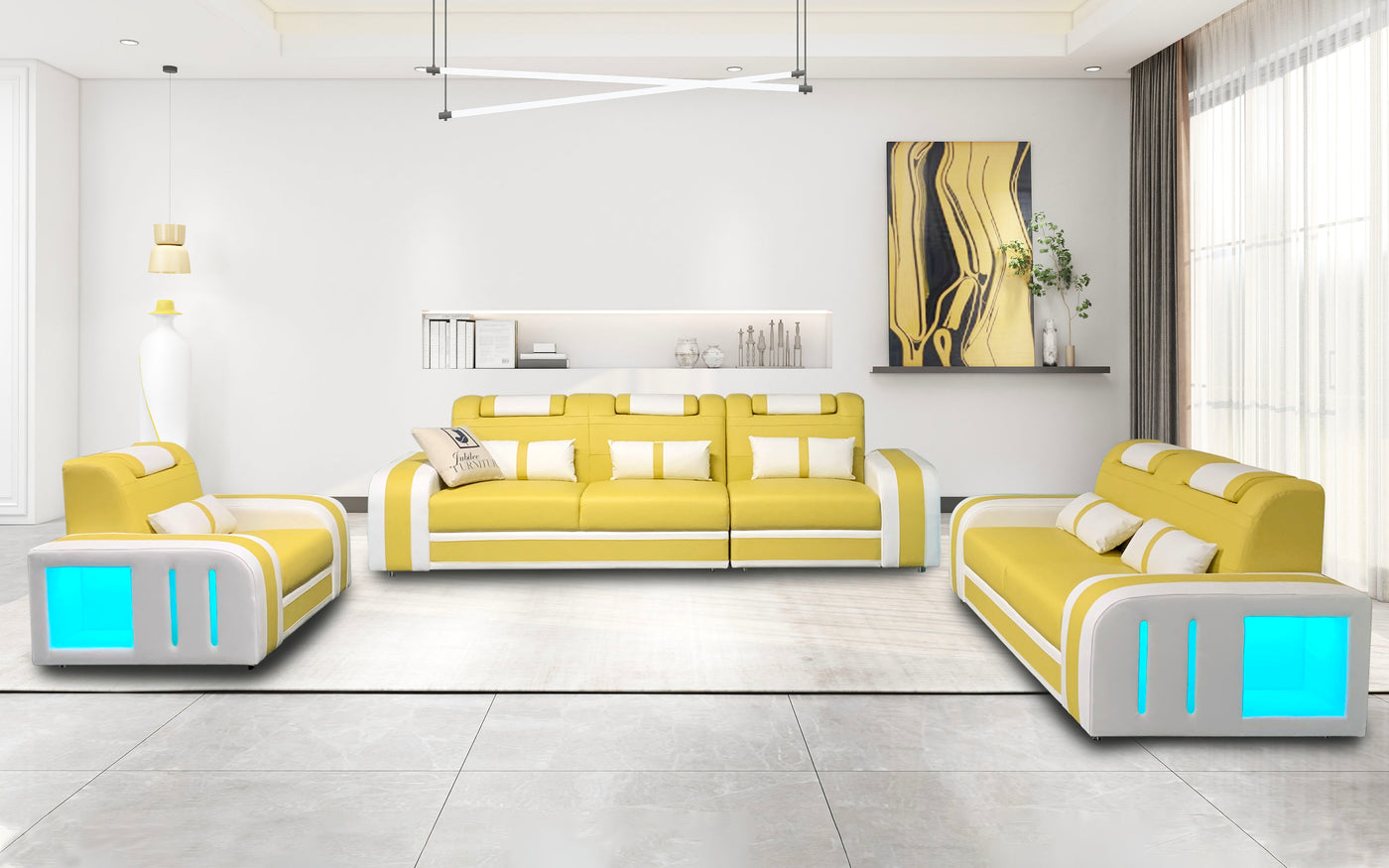 Looking for a contemporary and functional sofa set? Look no further than the Ralutic Leather Sofa Set with LED Light. This sleek and stylish sofa set is perfect for any modern living space. The set includes a sofa, loveseat, and chair, all upholstered in luxurious leather with adjustable headrests. The LED light feature adds a touch of ambiance to your room, making it perfect for movie nights or entertaining guests. With its durable construction and comfortable seating, this sofa set is sure to impress. Choose from a range of colors to match your decor.