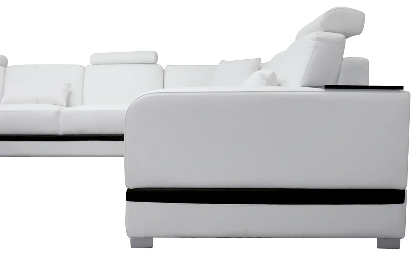 Elevate your living space with this stylish and comfortable futuristic piece. Its customizable configuration allows you to tailor the sectional to fit your unique space, with the option to face the chaise to the left or right. The armrests not only provide comfort but also offer storage space. The LED light on the side of the sectional can be upgraded to multi-color with a wireless remote, making it perfect for modern living. Choose from bonded leather or top grain leather and select from a range of color options, including custom requests.